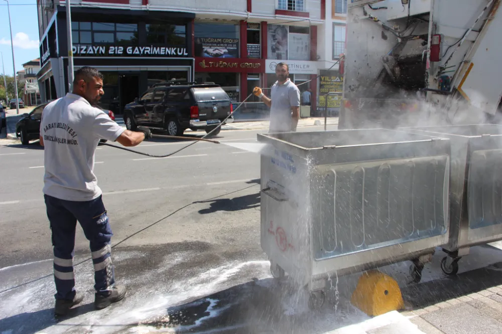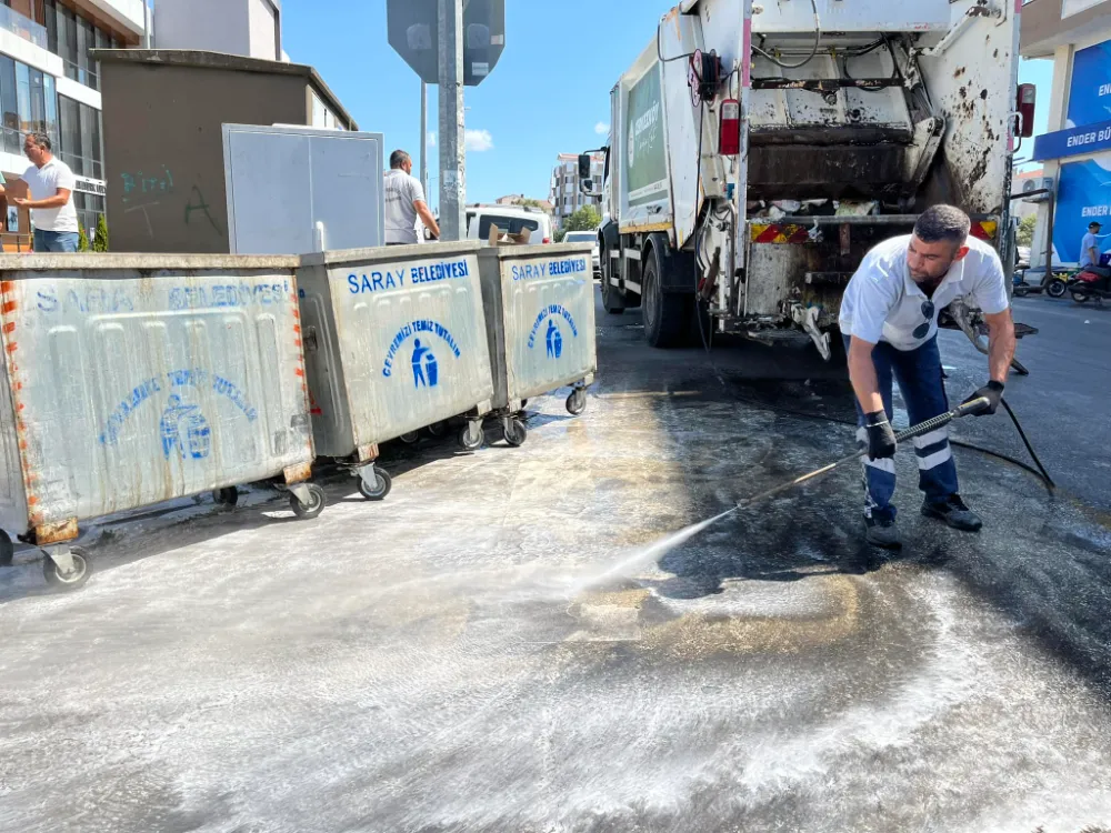 Daha temiz bir Saray için Saray Belediyesi Temizlik İşleri Müdürlüğü ekipleri, ilçe genelinde çöp konteynerlerini yıkama ve dezenfekte işlemlerine başladı.