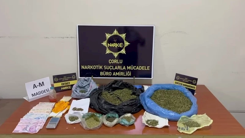 Tekirdağ İl Emniyet Müdürlüğünce Çorlu ve Çerkezköy ilçelerinde uyuşturucu ve uyarıcı madde ticareti yapan şahıslara yönelik çalışmalar sürüyor. Ekiplerce yapılan saha çalışmalarında 4 şahıs üzerinde ve 3 ikamette arama yapıldı. Yapılan aramalarda, 930 gram sentetik kannobinoid maddesi, 2 adet extacy hap, 1 adet hassas terazi ele geçirildi.