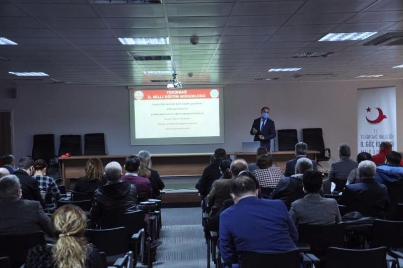 Çorlu Kaymakamı Cafer Sarılı’nın açılış konuşmasının ardından Tekirdağ İl Göç Müdürü Ömer Gümüş Tekirdağ il genelinde yürütülen uyum faaliyetleri ile Göç İdaresi Başkanlığı ve Hayat Boyu Öğrenme Genel Müdürlüğü arasındaki işbirliği protokolü çerçevesinde geliştirilen Sosyal Uyum ve Yaşam Eğitimi (SUYE) projesi hakkında sunum yaparak bilgiler verdi. Ardından Tekirdağ İl Milli Eğitim Müdürlüğü Şube Müdürü İsmail Yılmaz meslek edindirme kursları hakkında sunum gerçekleştirdi.