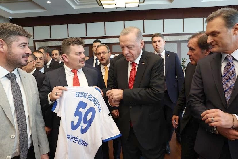Cumhurbaşkanı Recep Tayyip Erdoğan’ın katılımıyla Cumhurbaşkanlığı Külliyesi’nde "Futbol kardeşliktir" temasıyla düzenlenen ’Şut ve Gol: Türk Futbol Tarihi Sergisi’nin açılışına katılan Ergene Vellimeşespor Başkanı Serkan Bezgin, programın ardından Cumhurbaşkanı Recep Tayyip Erdoğan’a üzerinde isminin yazılı olduğu 59 numaralı Ergene Velimeşespor formasını takdim etti.