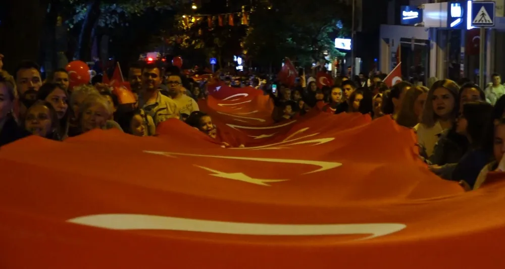 Etkinlikler Cumhuriyet Yürüyüşü ile devam etti. Vatandaşlar Özgürlük ve Demokrasi Meydanı’nda toplandı. Cumhuriyet’in 100. yılına özel düzenlenen yürüyüşte 100 metre bayrak açıldı. Marşlar eşliğinde sokaklarda yürüyen vatandaşlar bayramı büyük coşkuyla kutladı.