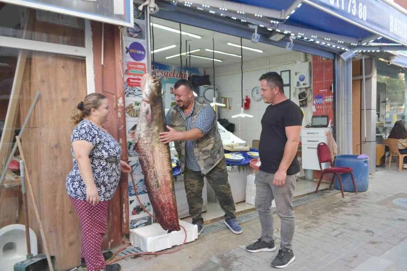 Tekirdağ’da 4 kişi tarafından oltayla zor yakalanan 80 kiloluk dev balık, görenleri hayrete düşürdü. Balıkçı tezgahına konulan yaklaşık 1,80 metre uzunluğundaki yayın balığını yoldan geçerken görenler bakakaldı.