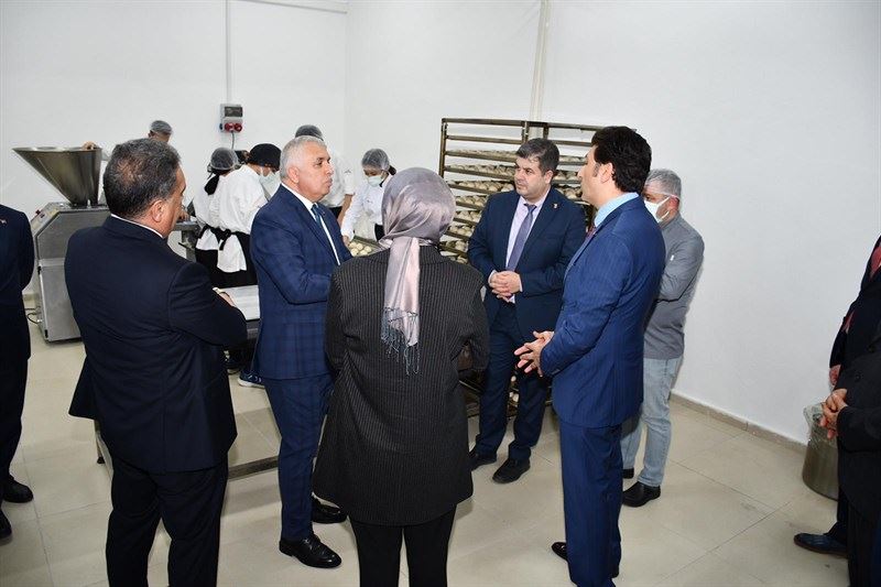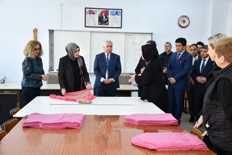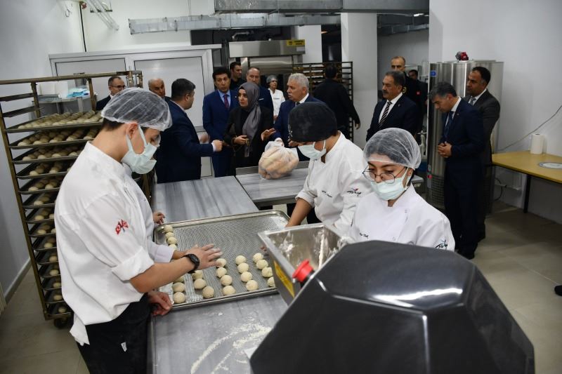 Vali Aziz Yıldırım ve Eşi Güllühan Yıldırım, kıyafet üretimi yapan lisenin ardından ekmek üretip deprem bölgesine gönderen Süleymanpaşa Mesleki ve Teknik Anadolu Lisesi’ni de ziyaret etti.