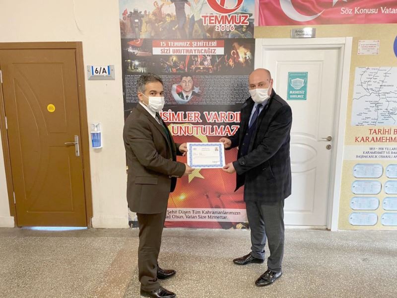 Yönetici ve öğretmenlere belgeleri Ergene Kaymakamı Mehmet Emin Taşçı ve Ergene İlçe Milli Eğitim Müdürü Özgür Parıltı tarafından takdim edildi.