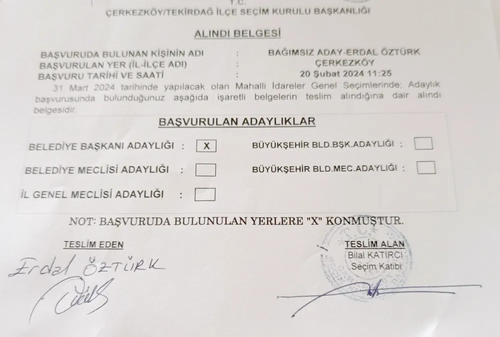 Öztürk bağımsız aday olarak Çerkezköy Belediye Başkanlığı’na aday olduğunu duyurdu.
