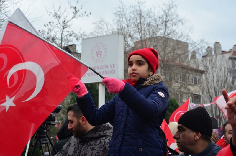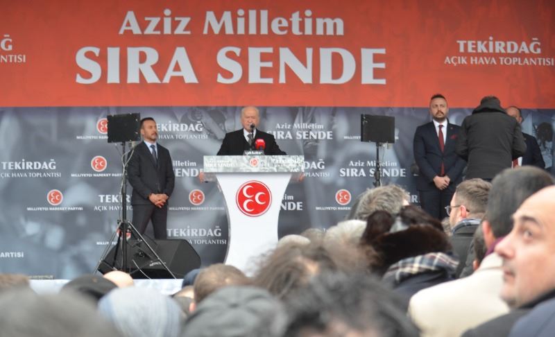 Milliyetçi Hareket Partisi Genel Başkanı Devlet Bahçeli, Tekirdağ’da “Aziz Milletim Sıra Sende” programı çerçevesinde vatandaşlara seslendi. Bahçeli, Süleymanpaşa ilçesinde bulunan Cumhuriyet Meydanı’nda toplanan vatandaşlara seslenerek, “Türkiye Cumhuriyeti’nin geleceği yabancı başkentlerde belirlenemez. Sandık New York’ta kurulmayacak, oylar Londra’da verilmeyecek, sayım Brüksel’de yapılmayacaktır. İrade sahibi Türk milleti, istiklalinin de sahibidir. Nitekim zalimlerin hükmü bu aziz millete sökmeyecektir. Bir masanın etrafında palas pandıras toplanmış makus partiler Türkiye’nin kanayan yarasıdır. Bunlar teslim bayrağı çekmiş, rehin alınmış, esarete düşmüş siyaset acizleridir. Zillet ittifakı Milli Mücadele’de yendiğimiz muhasım odakların izinde ve istikametindedir. Hiçbir milli konu umurlarında değildir. Ülkemizin hak ve çıkarlarına önem ve öncelik verdikleri yoktur. Bunlar batıdan aferin bekleyen Türkiye karşıtlarıdır. Bunlar batıdan takdir ve teveccüh gözleyen Türkiye aleyhtarlarıdır. Onlar aferini Avrupa’dan bekleye dursun, bize Türk milleti yetecektir. Onlar yabancı başkentlerde aferin kuyruğuna girsinler, bize Tekirdağ’ın sevgisi yeterlidir. Zillet ittifakının, 30 Ocak 2023 tarihinde açıkladığı Ortak Politikalar Mutabakat Metni’nde FETÖ’cülere af vaadi vardır. Pensilvanya’ya muhabbet vardır. KHK’lılara ümit vardır. PKK’ya açık çek vardır, HDP’ye güvence vardır, söz vardır, selam vardır, uzatılmış kirli el vardır." diye konuştu.