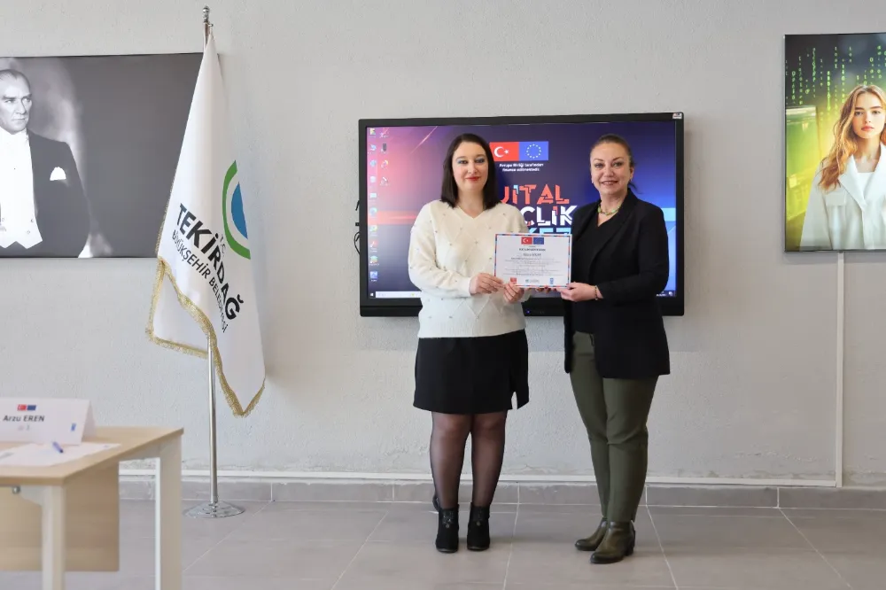 Eğitim programı sonunda belirlenen başarı kriterlerini sağlayan kursiyerlere, Tekirdağ Büyükşehir Belediyesi Kültür, Sanat ve Sosyal İşler Dairesi Başkanı Nilüfer Ayça Albayraktar tarafından, Avrupa Birliği, Birleşmiş Milletler Kalkınma Programı (UNDP), Türkiye Belediyeler Birliği ve Tekirdağ Büyükşehir Belediyesi logolarını taşıyan katılım sertifikaları takdim edildi.
