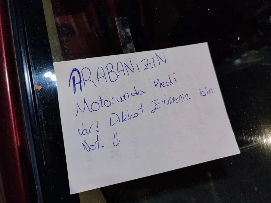 Edirne’nin Keşan ilçesinde, araçların motor bölümüne giren kedi, son girdiği otomobilin sahibine ulaşılamayınca otomobile not bırakıldı.
