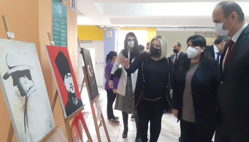 Vali Canalp ve beraberindeki heyet kütüphane açılışının ardından öğrencilerin yaptığı resimlerden oluşan sergiyi dolaşarak bilgi aldı.