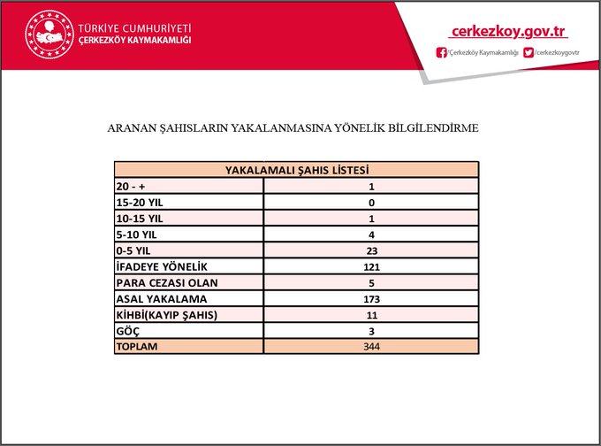 Kaymakamlığın yayınladığı verilere göre Emniyet Müdürlüğü’nün ve Jandarma Komutanlığı’nın Çerkezköy ilçesinde aranan şahısların yakalanmalarına yönelik yaptığı operasyonlarda, 20 yıl ve üzeri cezası olan şahıslardan 1 kişi, 15-20 yıl arası cezası olan şahıslardan 0, 10-15 yıl cezası olan şahıslardan 1 kişi, 5-10 yıl cezası olan şahıslardan 4 kişi, 0-5 yıl cezası olan şahıslardan 23 kişi, ifadeye yönelik yakalaması olanlardan 121 kişi, para cezası olanlardan 5 kişi, asal yakalaması olanlardan 173 kişi, kihbi (Kayıp Şahıs) olanlardan 11 kişi ve göç üzerine yakalaması olanlardan 3 kişi olmak üzere toplam 344 aranan şahıs yakalandı.