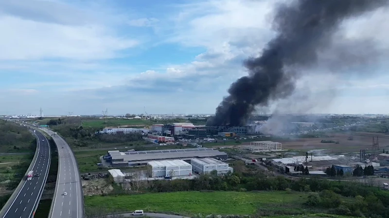Tekirdağ’da sünger fabrikasında çıkan yangın dron ile havadan görüntülendi.