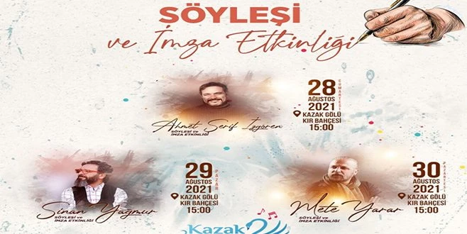 Okurlarıyla buluşacak Ahmet Şerif İzgören, Sinan Yağmur ve Mete Yarar?ın söyleşi ve imza etkinliği Kazak Gölü Kır Bahçesi?nde gerçekleştirilecek.
