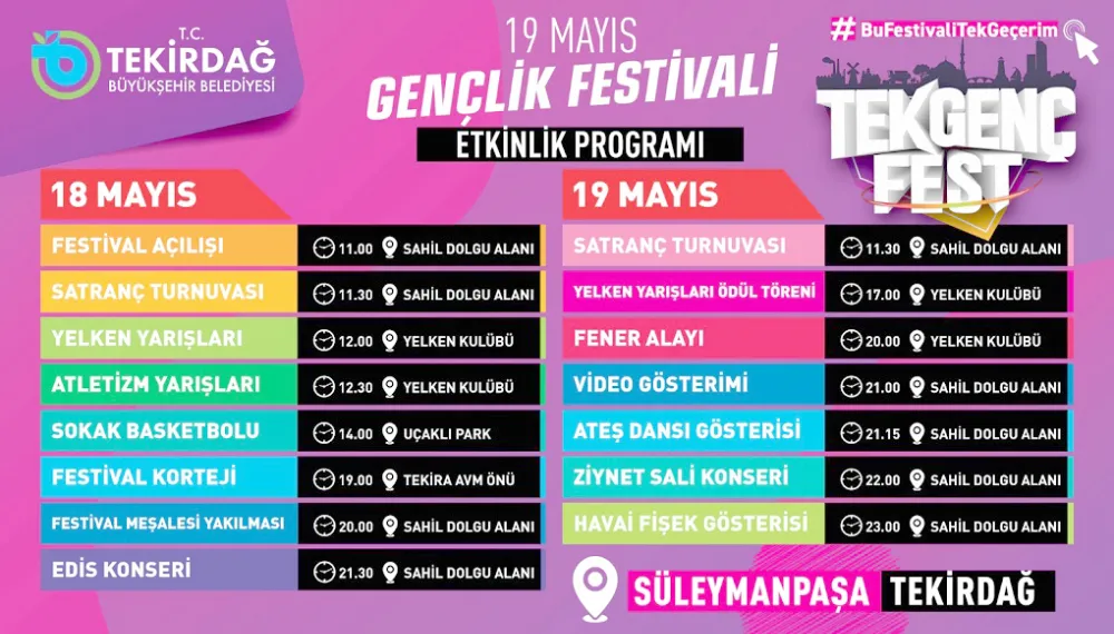 Tekirdağ’da 19 Mayıs Gençlik ve Spor Bayramı kapsamında 2 gün boyunca festival coşkusu yaşanacak. Tekirdağ Büyükşehir Belediyesi tarafından organize edilecek olan Tekirdağ Gençlik Festivali (Tek Genç Fest), 18-19 Mayıs tarihlerinde gerçekleştirilecek.