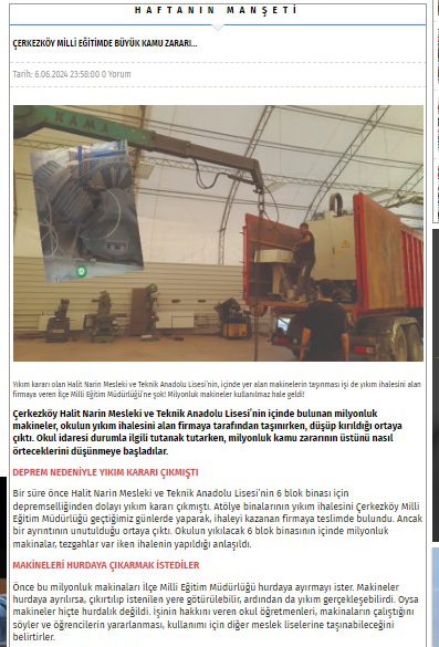 Daha önce Halit Narin Mesleki ve Teknik Anadolu Lisesi’nin 6 blok binası için depremselliğinden dolayı yıkım kararı çıkmıştı. Atölye binalarının yıkım ihalesini yapan Çerkezköy Milli Eğitim Müdürlüğü şubat ayı içinde ihaleyi kazanan firmaya teslimde bulundu. Ancak bir ayrıntının unutulduğu ortaya çıktı. Okulun yıkılacak 6 blok binasının içinde milyonluk makinalar, tezgahlar var iken ihalenin yapıldığı anlaşılmıştı. Bunun üzerine makinaların taşınmasına karar verilmiş, taşınmasının da aynı firma tarafından gerçekleşmişti. Haberin devamı için https://www.trakyaflashaber.com/haber/cerkezkoy_milli_egitimde_buyuk_kamu_zarari-34300.html