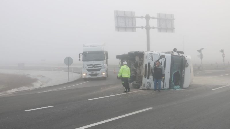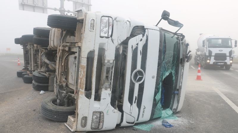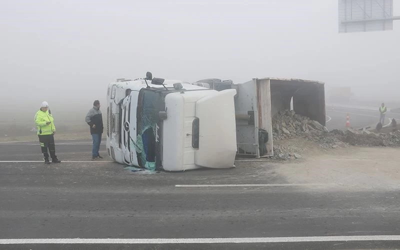 Edirne’de Halkalı-Kapıkule hızlı tren inşaatında çalışan hafriyat kamyonu yoğun sis sebebiyle devrilmesi sonucu 1 kişi yaralandı.