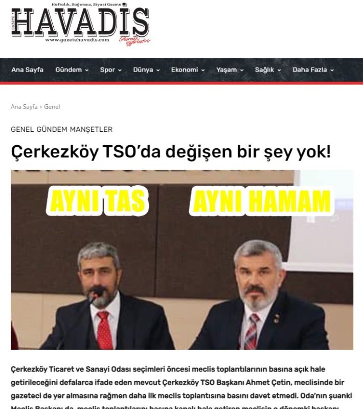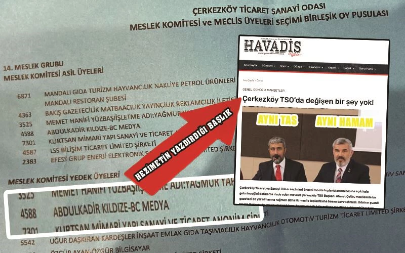 12 Kasım 2022 tarihinde gerçekleşen Çerkezköy TSO (Ticaret ve Sanayi Odası) Meslek Komitesi seçimlerinde Mavi Liste’nin adayı olan BC Medya’nın organı olan Havadis Gazetesi’nin, ÇTSO’nun organ seçimlerinin ardından ilk meclis toplantısı için attığı başlık, utanç verici oldu. Seçim hezimetinin adeta acısını çıkartan gazetenin başlığı bir kenara, bölgedeki tüm gazetecilerin takip ettiği ve bilgilendirildiği ÇTSO Kasım Ayı Meclis Toplantısı için de ‘basını davet etmedi’ iftirasını attı. Oysa, ÇTSO Basın Halkla İlişkiler Birimi’nden, ‘Mazbata takdimi ve organ seçimi’ dahil olmak üzere tüm gazetelere davet iletilmişti.
