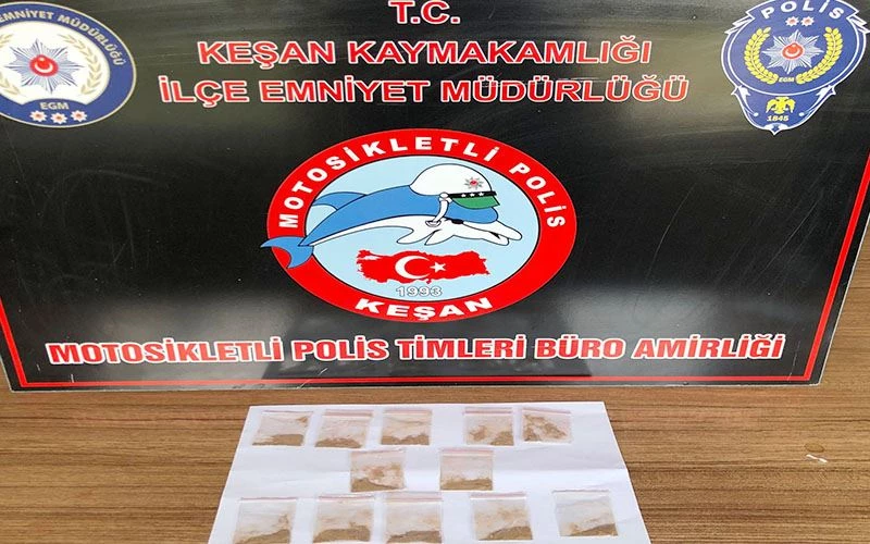 Edinilen bilgiye göre, Yenimescit Mahallesi’nde görev yapan Keşan İlçe Emniyet Müdürlüğü ekipleri durumundan şüphelendikleri bir kişiyi durdurdu. N.A. isimli şahsın yapılan üst aramasında 12 adet narkotik madde ele geçirildi. Gerekli işlemler için Narkotik Grup Amirliğine teslim edilen N.A. hakkında "kullanmak için uyuşturucu ve uyarıcı madde satın almak ve bulundurmak" suçundan işlem başlatıldı.