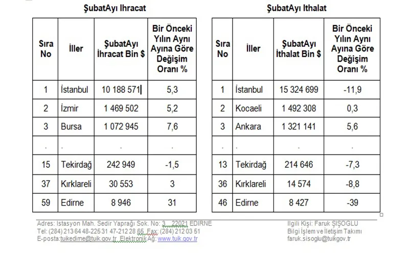 TÜİK’e göre, Tekirdağ, Edirne, Kırklareli İlleri 2024 Şubat ayı sonu ayı Dış Ticaret ve ihracat ithalat oranları şu şekilde verildi: