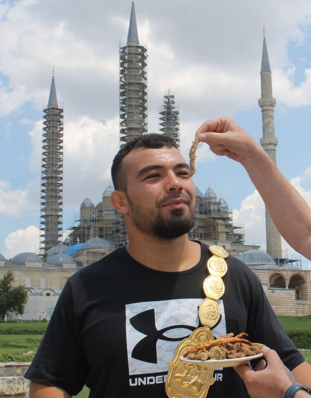 Selimiye Camisi meydanına gelen Başpehlivan Zeybek’e Edirneli esnaflar tarafından Edirne tava ciğeri ikram edilerek, tebrik ettiler.