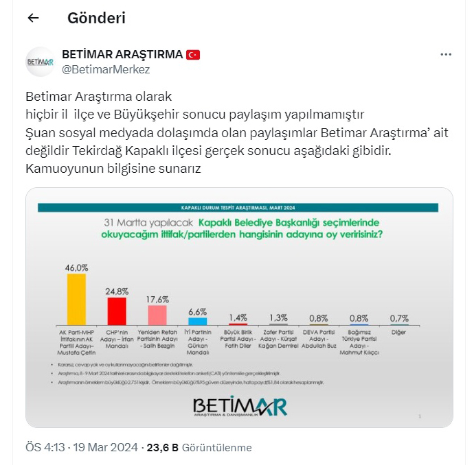 Yeniden Refah Partililer Kapaklı’da işte bu anket sonuçlarını paylaşarak vatandaşlara yalan yanlış yönlendirme yapmaya çalıştı. Betimar Araştırma adlı anket şirketine ait olduğu belirtilen anket sonuçlarının paylaşımı uzun sürmedi. Çünkü Betimar Araştırma, twitter hesabından yaptığı paylaşımda hem bu anket sonuçlarını yalanladı hem de gerçek anket sonuçlarını verdi. Bu sonuçlara göre son seçimde 2 bin civarı oy alan Yeniden Refah Partisi’nin bir anda yüzde 33’lerde oy alarak birinci sıraya oturduğu gözlendi. İlginç anket sonucu şaşkınlığa yol açarken Yeniden Refahlılar yalanlarını çok uzun süre sürdüremedi. Betimar Araştırma açıklamasında, “Betimar Araştırma olarak hiçbir il ilçe ve Büyükşehir sonucu paylaşım yapılmamıştır. Şu an sosyal medyada dolaşımda olan paylaşımlar Betimar Araştırma’ ait değildir Tekirdağ Kapaklı ilçesi gerçek sonucu aşağıdaki gibidir. Kamuoyunun bilgisine sunarız.” denildi.