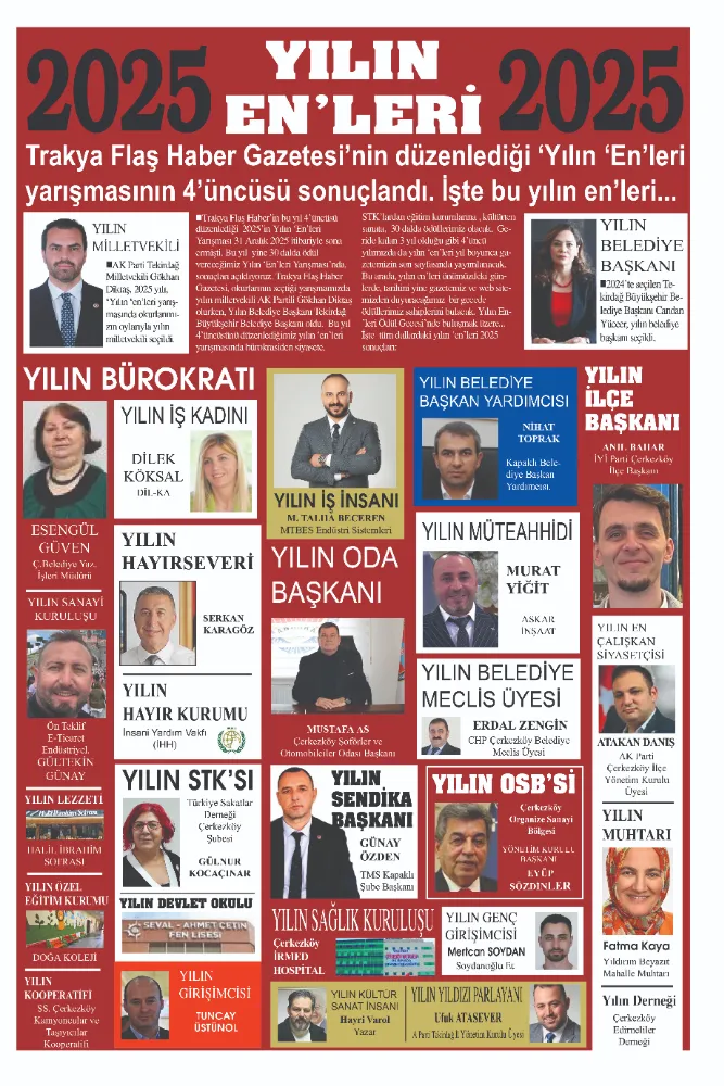 Trakya Flaş Haber’in bu yıl 4’nücüsünü düzenlediği 2025’in Yılın ‘En’leri Yarışması 31 Aralık 2025 itibariyle sona ermişti. Yılın ‘en’lerin bu sayımızda açıklıyoruz…