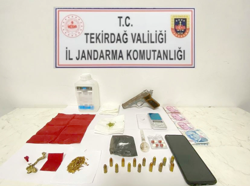 Çerkezköy ilçesi Kızılpınar Mahallesi’nde B.Y. isimli şahsın üst ve ev aramasında; 15 gram peçeteye emdirilmiş amfetamin, 70 gram sıvı amfetamin, 3 gram bonzai, 2 gram metanfetamin, 4 adet sentetik hap, 1 adet hassas terazi, 1 adet uyuşturucu kullanma aparatı, 1 adet tabanca, 14 adet 9 mm tabanca fişeği, 1 adet şüpheli obje, 2 adet amfetamin emdirmede kullanılan özel peçete ve suçtan elde edilen 600 TL nakit para ele geçirildi.