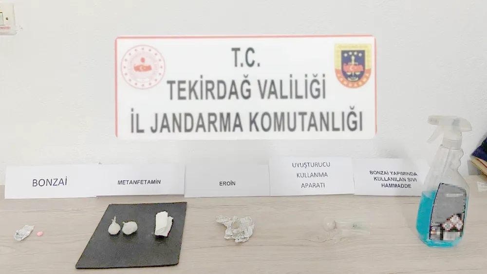 Ergene Yeşiltepe Mahallesi’nde K.S. ve T.Ç. isimli şahısların bulunduğu evde yapılan aramada; 10 gram metamfetamin, 5 gram eroin, 1 gram bonzai, 1 adet ecstacy hap, 305 mililitre bonzai yapımında kullanılan sıvı ham madde ve 2 adet uyuşturucu kullanma aparatı ele geçirildi.