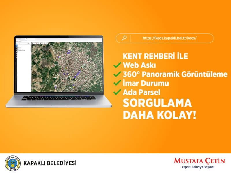 “Kapaklımızın yol ağını 360 derece panoramik olarak fotoğrafladık, ölçümledik. Bunun teknoloji sayesinde sahaya inmeden personelimiz web ortamında hangi sokakta, hangi caddede, ne kadar genişlikte yolumuz var, kaldırım genişliğinden, bordür taşların genişliğine kadar hepsini internet ortamında görebiliyor. Aynı şekilde vatandaşlarımızda bu hizmet sayesinde kent rehberi üzerinde aradığı ada parseli 360 derece panoramik olarak görüntüleyebilecek. Vatandaşlarımız Kapaklı Belediyesi Kent Rehberi sayfasına üzerinden ulaşılabileceği gibi Kapaklı Belediyesi web sayfasındaki ‘Kapaklı’ sekmesi içerisinde yer alan Kent Rehberi başlığı üzerinden de ulaşılabilecek. Ayrıca yine web sitesinde yer alan hızlı menülerdeki Kent Rehberi ikonundan da kolayca erişim sağlanabilir.”