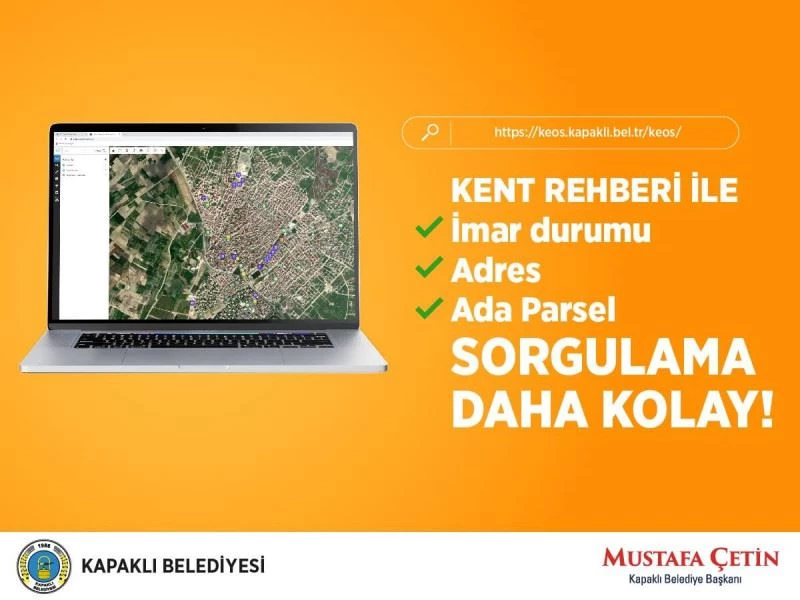 Hizmete giren Kapaklı Belediyesi Kent Rehberi sayesinde vatandaşlar aradıkları adres, ada/parsele https://keos.kapakli.bel.tr/keos/ internet adresi üzerinden kolaylıkla ulaşabilecek.