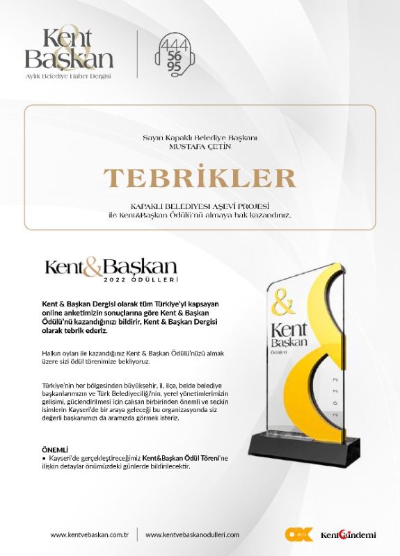 Kent ve Başkan Dergisi’nin tüm Türkiye’yi kapsayan online anketi sonuçlarına göre Kent ve Başkan Ödülü’nü Kapaklı Belediyesi Aşevi Projesi’nin kazandığı bildirildi. Kent ve Başkan Dergisi’nin Kayseri’de gerçekleştirilecek olan ödül törenine ilişkin tarih ve diğer bilgilerin ise önümüzdeki günlerde Kapaklı Belediyesi’ne bildirileceği belirtildi.
