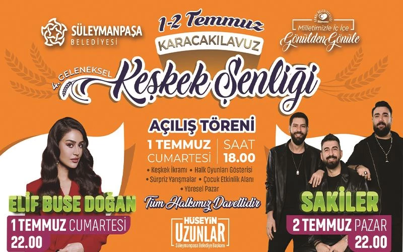 Süleymanpaşa Belediyesi tarafından bu yıl dördüncüsü gerçekleştirilecek olan Karacakılavuz Geleneksel Keşkek Şenliği, 1-2 Temmuz tarihlerinde misafirlerini ağırlayacak. Keşkek Şenliği’nin bu yılki sanatçıları Elif Buse Doğan ve Sakiler olacak.