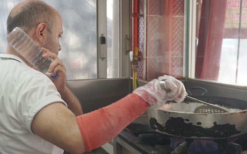 Bu şekilde tava başında çalışan meslektaşlarına kolaylıklar dileyen Taşkıran, "Yakınımızda varsa cam açıyoruz yoksa su yardımıyla kendimizi serinlemeye çalışıyoruz. Klimadan mümkün olduğunca uzak durmaya çalışıyoruz. O da sağlık açısından. El avlusu ile terlerimizi sileriz. Bu şekilde idare etmeye çalışıyoruz. İş esnasında ya da müsait bir zamanımızda soğuk su ile serinlemeye çalışıyoruz. Normal şartlarda işte yoruluyorsunuz ama sıcak 2 kat daha fazla yoruyor" dedi.