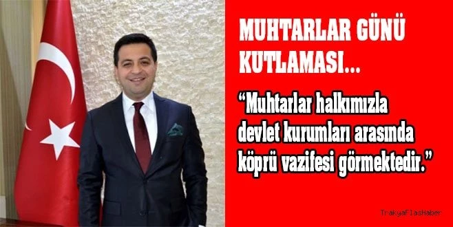 19 Ekim Muhtarlar Günü, demokrasi piramidimizin tabanıyla tavanının buluşması, kucaklaşması amacıyla ülkemizde yeni ve hayırlı bir geleneğin tesisine de vesile olmaktadır. Bu duygu ve düşüncelerimle, muhtarlarımıza yapmış oldukları hizmetlerinden dolayı şükranlarımı sunuyor, Devletimize ve Milletimize hizmet etmiş olup ebediyete intikal etmiş olan muhtarlarımıza Allah?tan rahmet diliyorum. İlçemizdeki tüm Mahalle muhtarlarımızın `Muhtarlar Günü?nü en kalbi duygularımla kutluyor, saygı ve muhabbetlerimi sunuyorum."
