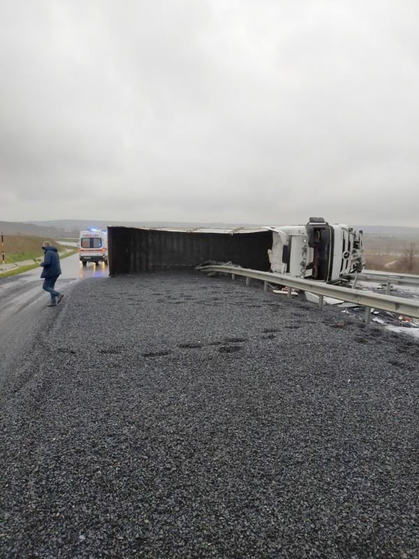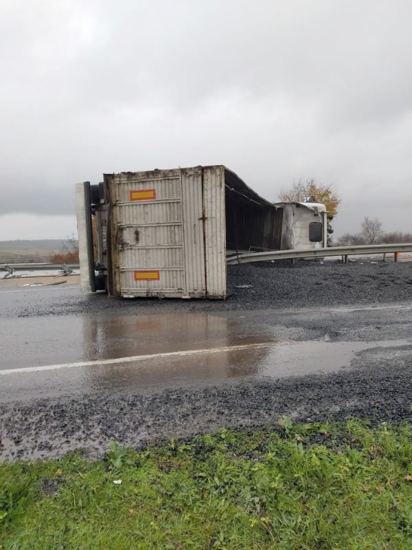 Edirne’nin Uzunköprü ilçesinde kontrolden çıkan kömür yüklü tır, havanın yağışlı olması sebebiyle keskin virajda direksiyon hakimiyetinin kaybetmesi sonucu yan yatarak yaklaşık 100 metre sürüklenirken, sürücü kazadan yara almadan kurtuldu.
