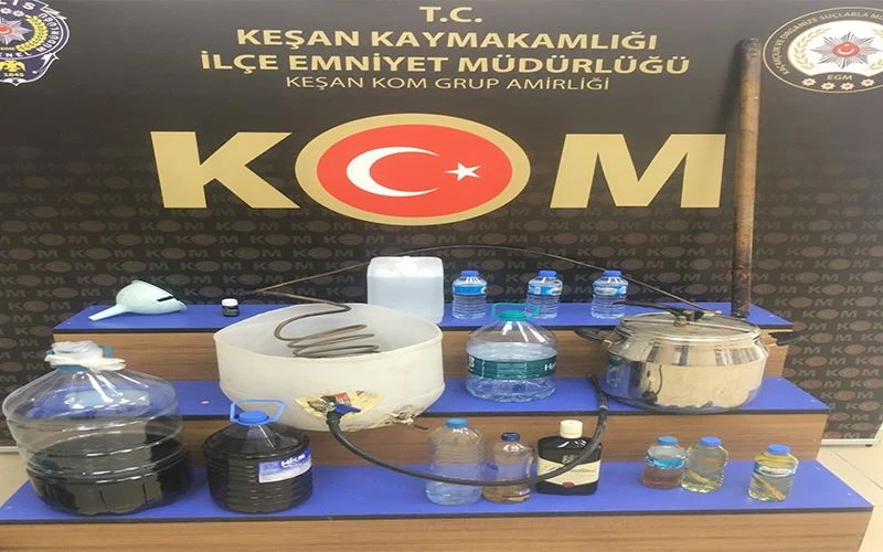 Edinilen bilgiye göre, Keşan’da sahte içki üretildiği hakkında duyum alan İlçe Emniyet Müdürlüğü, Kaçakçılık ve Organize Suçlarla Mücadele Grup Amirliği ekipleri, alınan karar doğrultusunda belirlenen adrese baskı düzenledi. F.G. isimli şahsa ait Yukarı Zaferiye Mahallesi’nde bulunan bir işyerinde arama yapan ekipler, pet bidon ve şişeler içinde yaklaşık 30 litre sahte rakı ve viski ele geçirdi. Ayrıca sahte alkolü hazırlamak için kullanılan 1 adet dereceli kaynatma kazanı, 1 adet damıtma borusu ile 1 adet toplama bidonuna da polis el koyarken, F.G. hakkında işlem başlatıldı.
