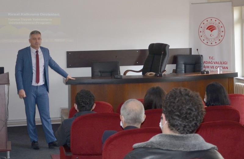 Tekirdağ İl Tarım ve Orman İl Müdürlüğü toplantı salonunda, Tarıma Dayalı Ekonomik Yatırımların Desteklenmesi ve Tarıma Dayalı Altyapı Yatırımlarının Desteklenmesi yatırım konularının başvuru şartları ve uygulamaları hakkında, kent genelindeki tarımsal amaçlı oda, birlik personeli ve tarım danışmanlarına yönelik bilgilendirme toplantısı düzenlendi.