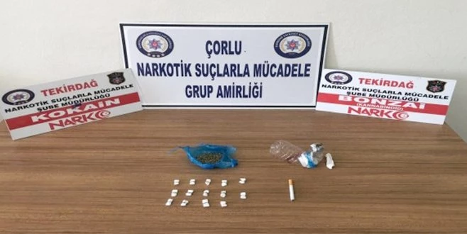 Çorlu`da düzenlenen uyuşturucu operasyonunda kokain ve bonzai ele geçiren polis ekipleri, 2 kişiyi de gözaltına aldı.