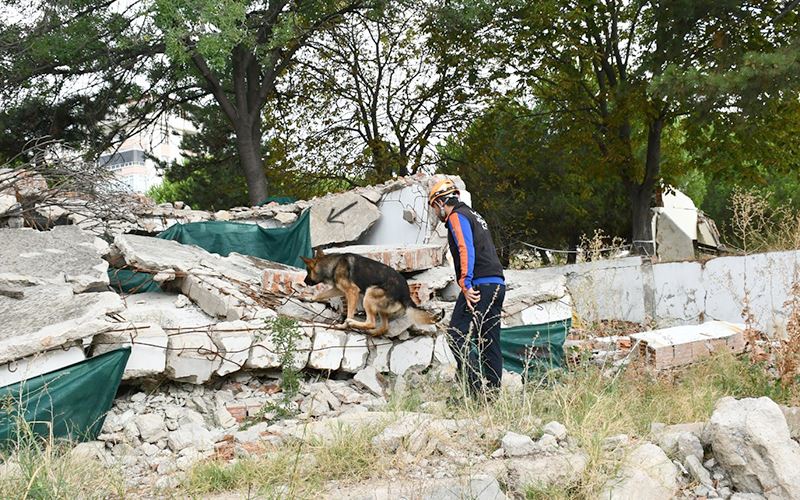 Eski Tekel Fabrikası’nda düzenlenen tatbikatta senaryo gereği göçük altında kalan bir kişiyi, köpekler koku alma duyuları yoluyla bularak kurtarılmasını sağladı.