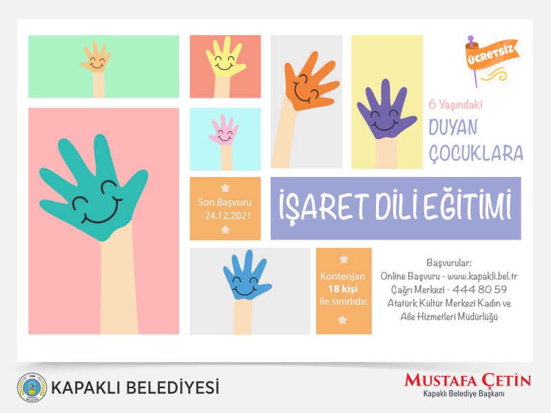 Yetişkinlerin yanı sıra gençlere ve çocuklara yönelik de kurslar düzenleyen Kapaklı Belediyesi tarafından Kadın ve Aile Hizmetleri Müdürlüğü bünyesinde 6 yaşındaki duyan çocuklara yönelik İşaret Dili Eğitimi verilecek. 18 kişilik kontenjanın olduğu kursun son başvuru tarihi 24 Aralık olarak belirlendi. İşaret Dili Eğitimi çocuklara, dil ve okuma becerileri gelişimi, bilişsel gelişim (görsel ve uzamsal kavramlar), duygusal ve sosyal gelişimi üzerinde olumlu etki sağlıyor.