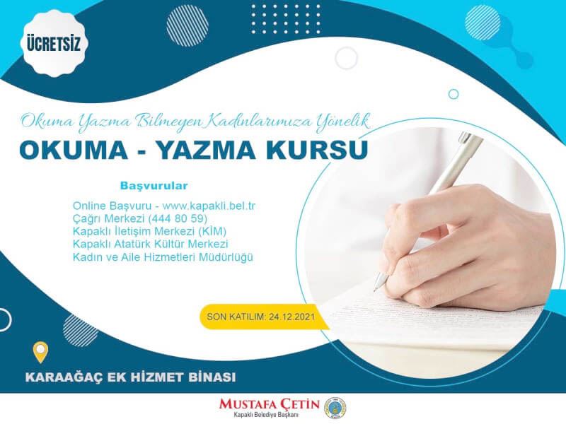 Vatandaşlar düzenlenecek kurslara https://www.kapakli.bel.tr/kapakli/formlar/basvuru-formlari üzerinden online veya Atatürk Kültür Merkezi ile Kapaklı İletişim Merkezi’nden yüz yüze başvuru yapabilir, 444 80 59 Çağrı Merkezi üzerinden kurslar ile ilgili bilgi alabilirler.