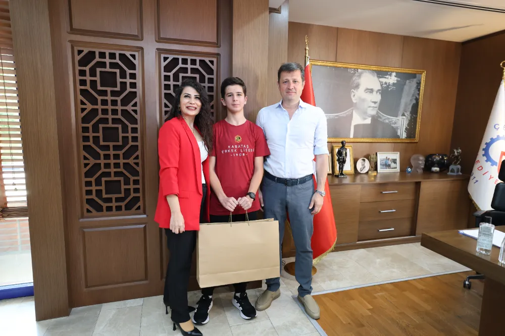 Liselere Geçiş Sınavı’nda (LGS) 500 tam puan alarak Türkiye birincileri arasında yer alan Gökhan Öztürk, Belediye Başkanı Vahap Akay’ı makamında ziyaret etti.