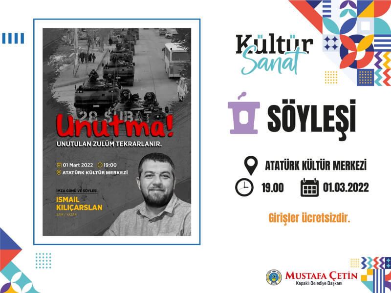 Mart ayı kültür sanat etkinlikleri 1 Mart Salı günü 19.00’da Şair-Yazar İsmail Kılıçarslan söyleşisi ile başlayacak. Şair-Yazar Kılıçarslan, 28 Şubat konulu söyleşisinin ardından okurları için kitaplarını imzalayacak.