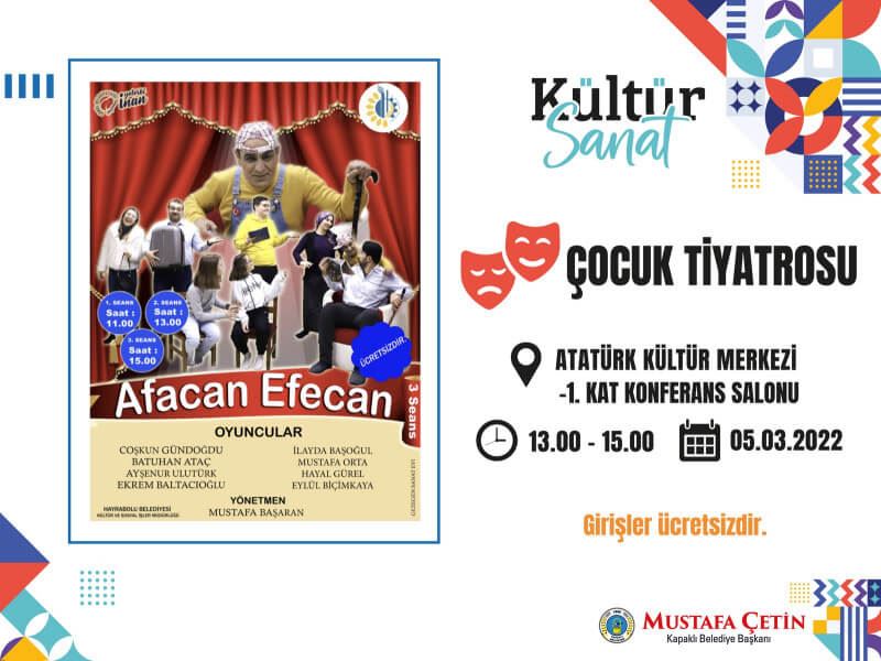 Kapaklı Belediyesi tarafından çocukların kültür sanatla buluşturulduğu etkinlikler mart ayında da devam ediyor.  Hayrabolu Belediyesi Kültür ve Sosyal İşler Müdürlüğü Çocuk Tiyatrosu ekibi tarafından ‘Afacan Efecan’ adlı oyun 5 Mart Cumartesi günü 13.00 ve 15.00 saatleri olmak üzere 2 seans halinde sahnelenecek. 27 Mart Pazar günü ise ‘Floyd Usta’nın Düşler Atölyesi’ adlı tiyatro oyunu 12.00, 13.30 ve 15.00 saatleri olmak üzere 3 seans halinde Kapaklılı çocuklarla buluşacak.