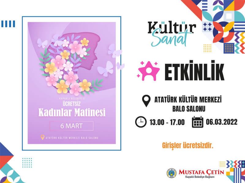 8 Mart Dünya Emekçi Kadınlar Günü dolayısıyla 6 Mart Pazar günü 13.00 ile 17.00 saatleri arasında kadınların doyasıya ve gönüllerince eğleneceği Kadınlar Matinesi programı düzenlenecek.