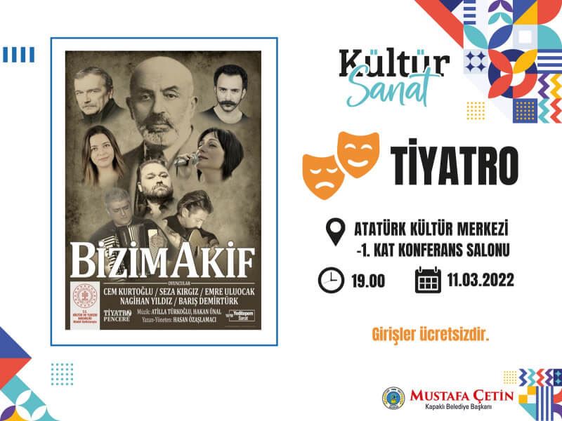 Mart ayı kültür sanat etkinlikleri kapsamında üç önemli tiyatro oyunu sanatseverlerle buluşturulacak. 12 Mart İstiklal Marşı’nın Kabulü ve Mehmet Akif Ersoy’u Anma Günü’ne özel ‘Bizim Akif’ adlı tiyatro oyunu 11 Mart Cuma günü Atatürk Kültür Merkezi’nde saat 19.00’da sahnelenecek. Tiyatro gösterimleri 22 Mart Salı günü saat 19.00’da  ‘Girdap’ adlı oyunun sahnelenmesiyle devam edecek. 27 Mart Salı günü saat 19.00’da ise ünlü oyuncular Tayanç Ayaydın, Emel Çölgeçen, Anıl Çelik, Tolga Güleç ve Şeyma Gökçe Cengiz’in rol aldığı ‘Sır’ adlı oyun sahnelenecek.