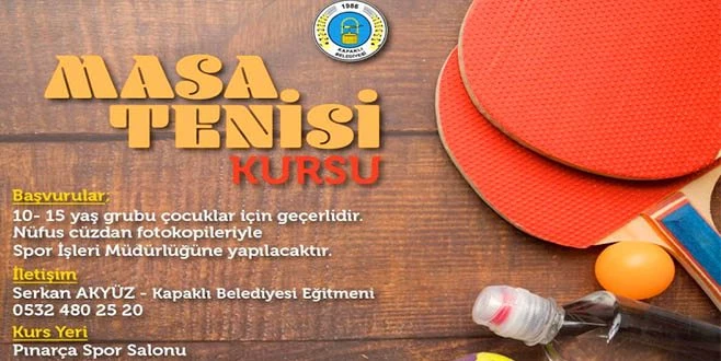 Kapaklı Belediyesi Spor İşleri Müdürlüğü tarafından 10-15 yaş grubunun katılabileceği Masa Tenisi Kursu kayıtları başladı. Spor İşleri Müdürlüğünden yapılan açıklamada 20 Mart Cuma günü sona erecek kurs kayıtlarının Kapaklı Belediyesi 9. Katta bulunan Spor İşleri Müdürlüğü`nde alınacağı ifade edildi.