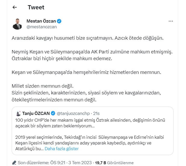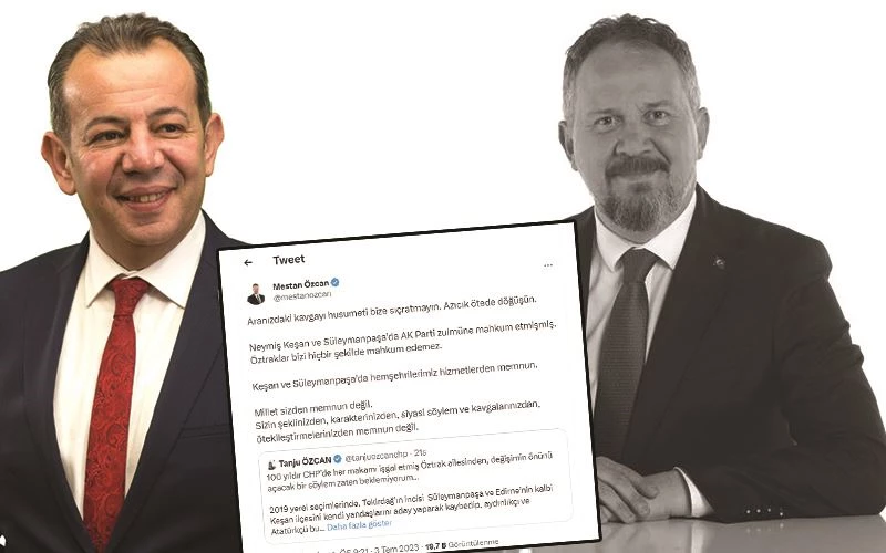 Partisiyle arası açık olan CHP’li Bolu Belediye Başkanı Tanju Özcan’ın sosyal medya hesabından yaptığı paylaşımla CHP Genel Başkan Yardımcısı ve Tekirdağ Milletvekili Faik Öztrak’a yönelik sözlerine AK Partili Mestan Özcan’dan cevap geldi. Tanju Özcan’ın paylaşımını etiketleyen AK Partili Mestan Özcan, paylaşımında şunları söyledi: “Aranızdaki kavgayı husumeti bize sıçratmayın. Azıcık ötede dövüşün. Neymiş Keşan ve Süleymanpaşa’da AK Parti zulmüne mahkum etmişmiş. Öztraklar bizi hiçbir şekilde mahkum edemez. Keşan ve Süleymanpaşa’da hemşehrilerimiz hizmetlerden memnun. Millet sizden memnun değil. Sizin şeklinizden, karakterinizden, siyasi söylem ve kavgalarınızdan, ötekileştirmelerinizden memnun değil.”