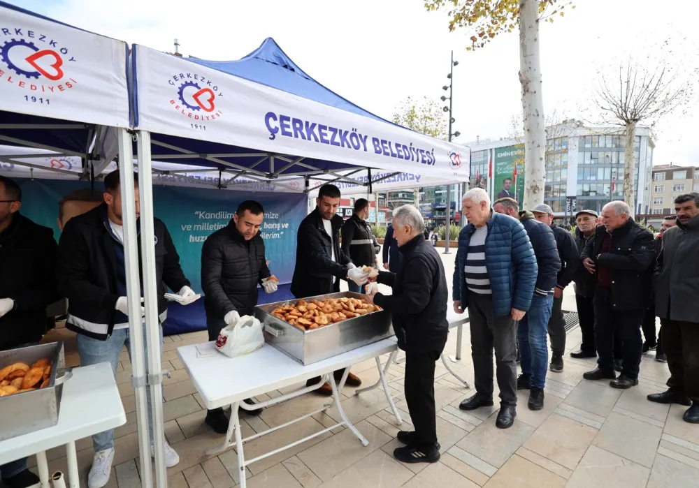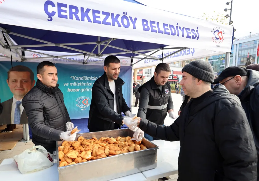 Çerkezköy Belediyesi tarafından Miraç Kandili nedeni ile Cumhuriyet Meydanı’nda vatandaşlara gün boyu ‘Pişi’ ikram edildi.