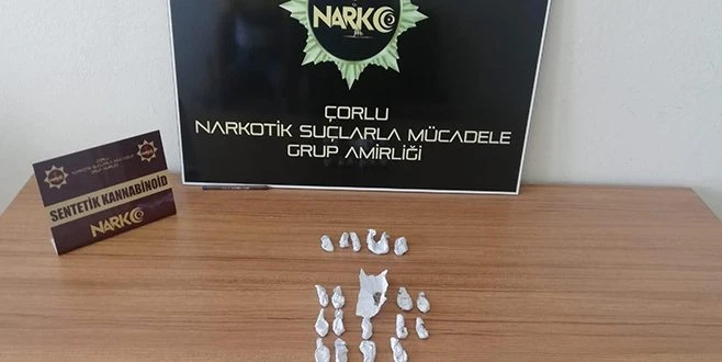 Narkotik Suçlarla Mücadele Şube Müdürlüğü Çorlu Grup Amirligi ekipleri de Çorlu-Çerkezköy yolunda durumundan şüphelendikleri K.S, M.A, E.G ve E. A`yı durdurdu. Şüphelilerin üzerinde yapılan aramada bir miktar uyuşturucu madde ele geçirildi. Gözaltına alınan K.S, M.A, E.G, İ.B. ve E. A?nın emniyetteki işlemleri sürüyor.