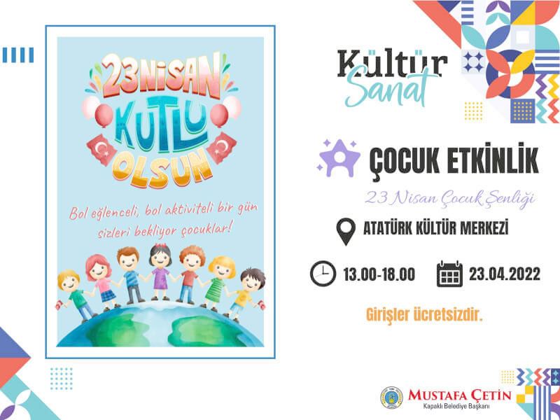 23 Nisan Ulusal Egemenlik ve Çocuk Bayramı’nı Kapaklı’da coşku ve heyecan içerisinde kutlanacak. Yüz boyama, maskotlar, atölye çalışmaları ve birbirinden renkli eğlencelerin yer alacağı 23 Nisan Çocuk Şenliği, 23 Nisan Cumartesi günü 13.00-18.00 saatleri arasında Atatürk Kültür Merkezi’nde gerçekleştirilecek.